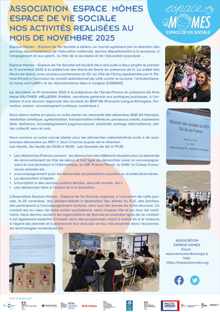 L’Association Espace Mômes – Espace de Vie Sociale organise, à l’occasion de cette jour- née, le 25 novembre, des ateliers-débats à destination des élèves du FLE, des familles, des participants à l’accompagnement scolaire, ainsi que des jeunes de notre structure. Ce combat est au cœur de notre action quotidienne, dans chaque ville et sur tous les conti- nents. Nous devons soutenir les organisations de femmes en première ligne de ce combat. Il est également essentiel d’investir dans des programmes visant à mettre fin à la violence à l’égard des femmes et à promouvoir leur inclusion et leur rôle essentiel dans l’économie, les technologies numériques etc…