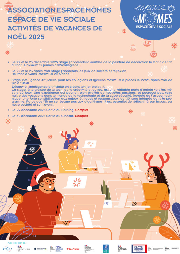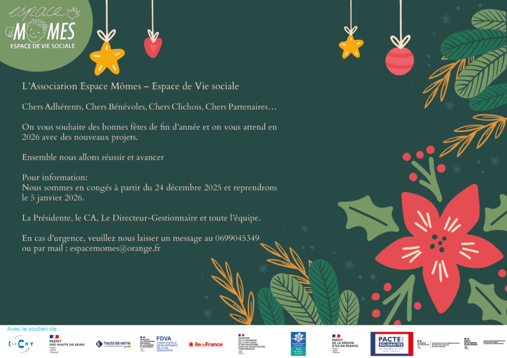 Espace Mômes – Espace de Vie Sociale vous invite le mardi 16 décembre 2025 de 18h à 19h. à notre spectacle surprise de fin d’année dans nos locaux au 34 rue Georges Boisseau 92110 Clichy.