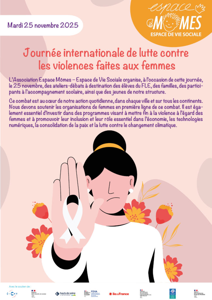 L’Association Espace Mômes – Espace de Vie Sociale organise, à l’occasion de cette journée, le 25 novembre, des ateliers-débats à destination des élèves du FLE, des familles, des partici- pants à l’accompagnement scolaire, ainsi que des jeunes de notre structure.