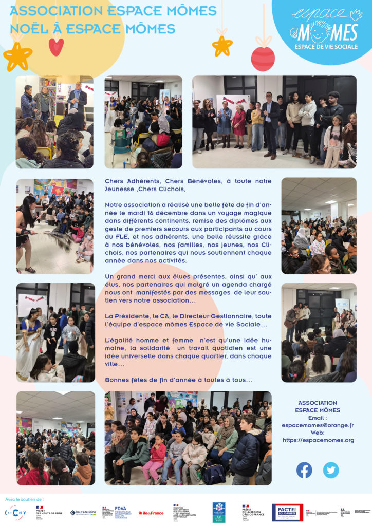 Notre association a réalisé une belle fête de fin d’année le mardi 16 décembre dans un voyage magique dans différents continents, remise des diplômes aux geste de premiers secours aux participants au cours du FLE, et nos adhérents, une belle réussite grâce à nos bénévoles, nos familles, nos jeunes, nos Clichois, nos partenaires qui nous soutiennent chaque année dans nos activités.
