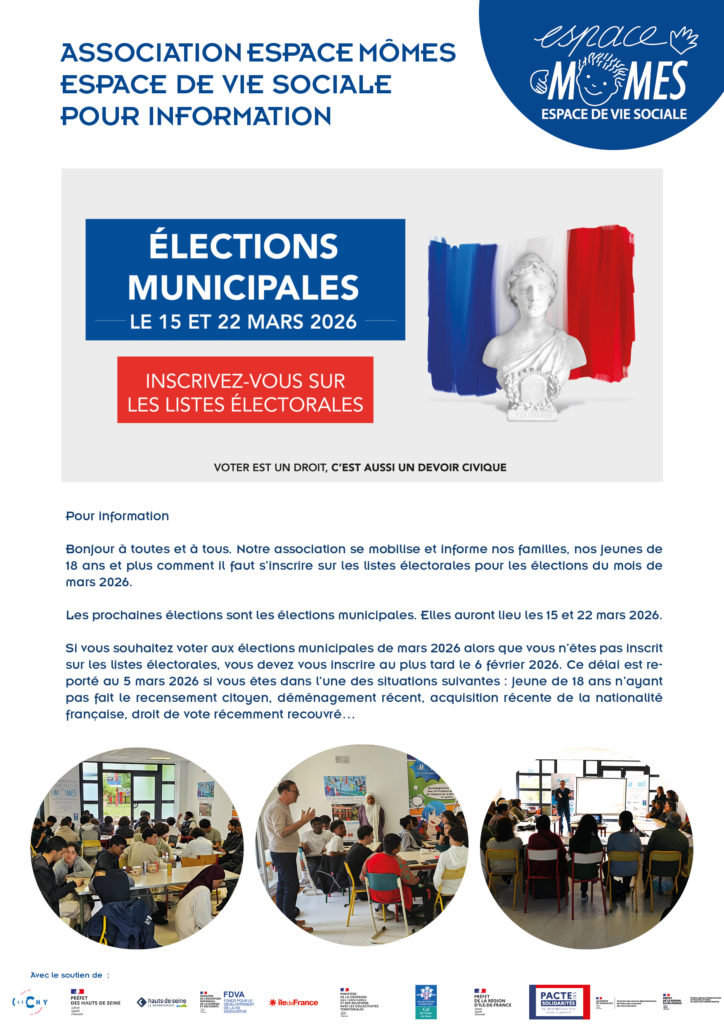 Bonjour à toutes et à tous. Notre association se mobilise et informe nos familles, nos jeunes de 18 ans et plus comment il faut s’inscrire sur les listes électorales pour les élections du mois de mars 2026.