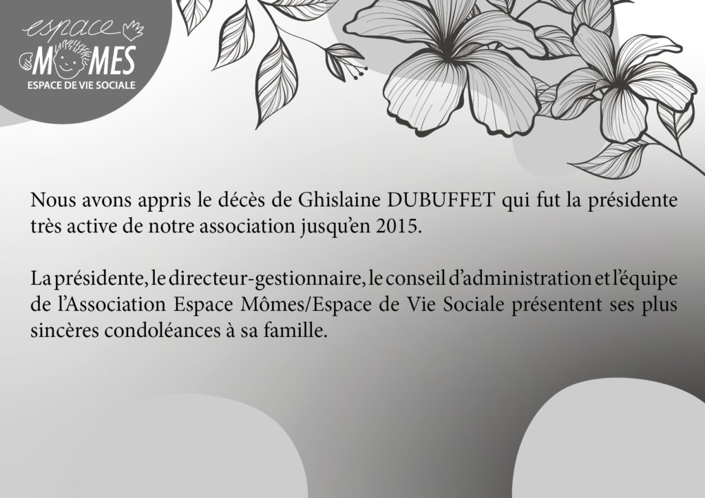 La présidente, le directeur-gestionnaire, le conseil d’administration et l’équipe de l’Association Espace Mômes/Espace de Vie Sociale présentent ses plus sincères condoléances à sa famille.